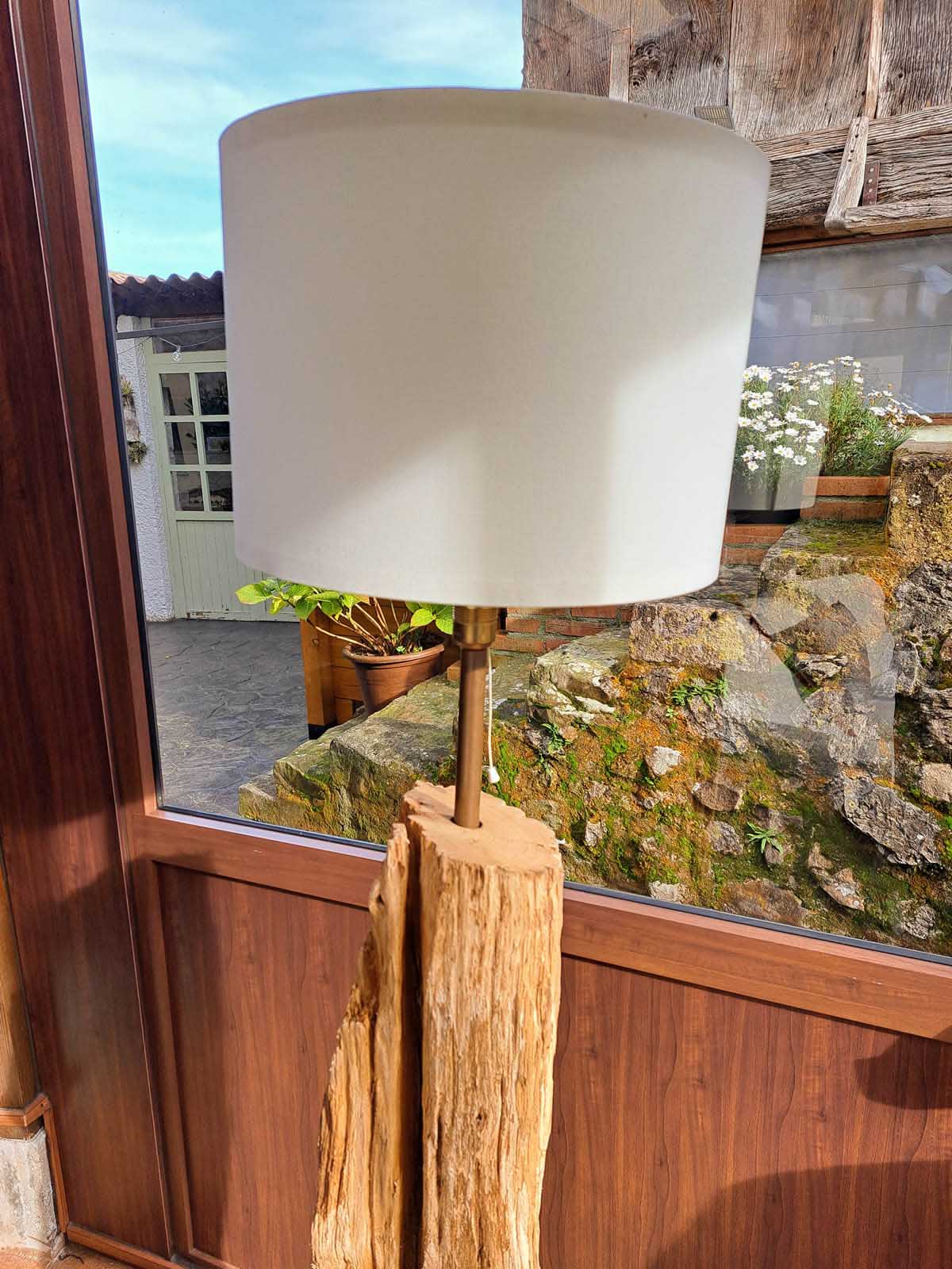 Trozo de viga de castaño antigua recuperada, tubo de cobre y tulipa.